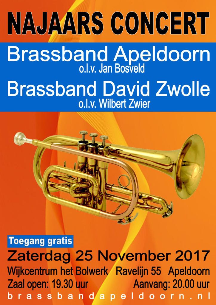 Op zaterdag 25 novemer geven wij samen met Brassband Apeldoorn een Najaarsconcert in Apeldoorn. Locatie: Wijkcentrum het Bolwerk Adres: Ravelijn 55, Apeldoorn Aanvang: 20.00 uur (zaal open: 19.30 uur) Toegang: GRATIS