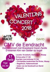 In samenwerking met fanfare 'de Eendracht' uit Wezep zullen we een romantisch Valentijnsconcert geven. Extra speciaal is dat dit concert in het teken zal staan van het D-examen van Kim van Gelder. Kim is lid van beide orkesten en zal met beide orkesten solowerken ten gehore brengen.